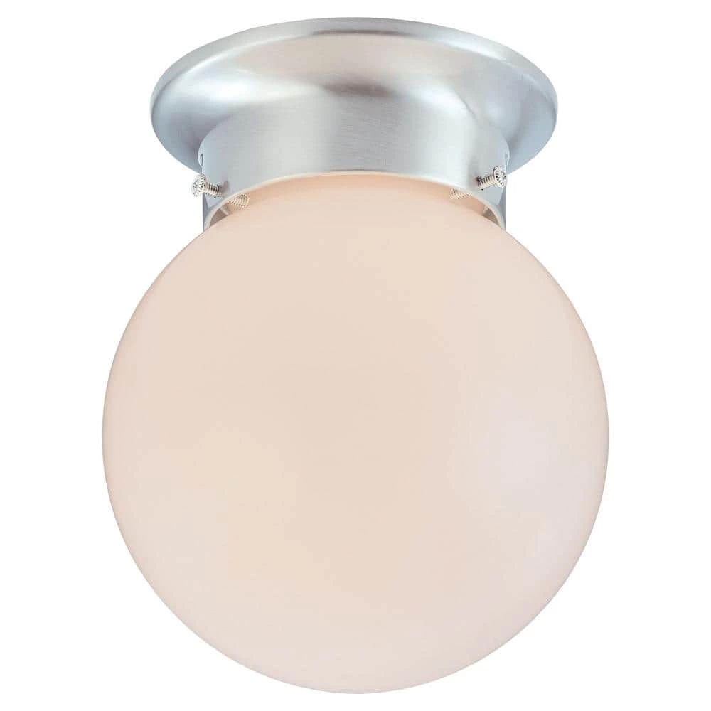 This one-light ceiling mount fixture comes in a brushed nickel finish. A classic design that will offer your room a warm and inviting ambiance. This beautiful fixture with a white globe style glass shade is ideal for use in bathrooms, laundry rooms and bedrooms. Rated for damp locations and for a 90C supply wire.