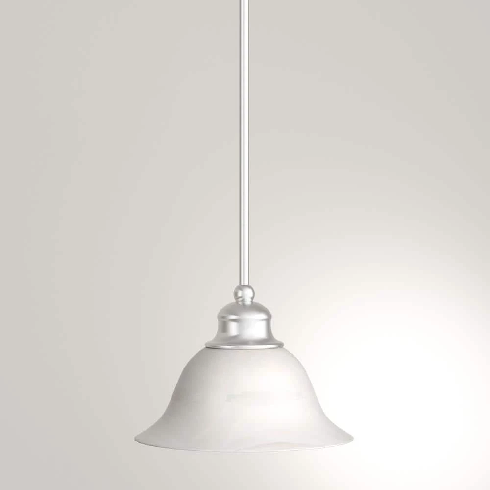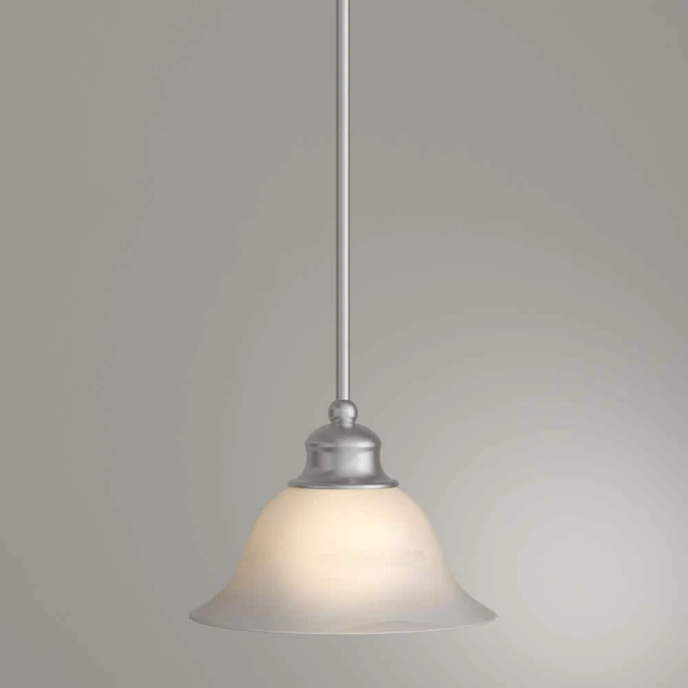 A simple yet classic design offers your room a warm and inviting ambiance. This 1-Light Brushed Nickel Hanging Pendant comes in a brushed nickel finish with an alabaster etched style glass shade. A beautifully finished fixture that is ideal for use in dining rooms, kitchens and other living areas, it comes supplied with a 12 ft. wire, two 12 in. rods and two 6 in. rods to help you create the desired length that best fits your space.