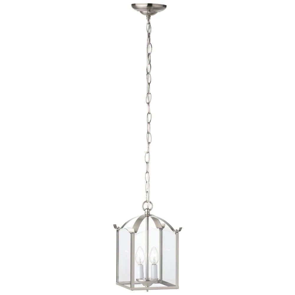 This 2-light chandelier comes in a brushed nickel finish with clear glass panels. A traditional piece, it is supplied with a 4 ft. chain and a 12 ft. wire to help reach a maximum height of 60 in. Ideal for your foyer, using two Philips candle light bulbs.