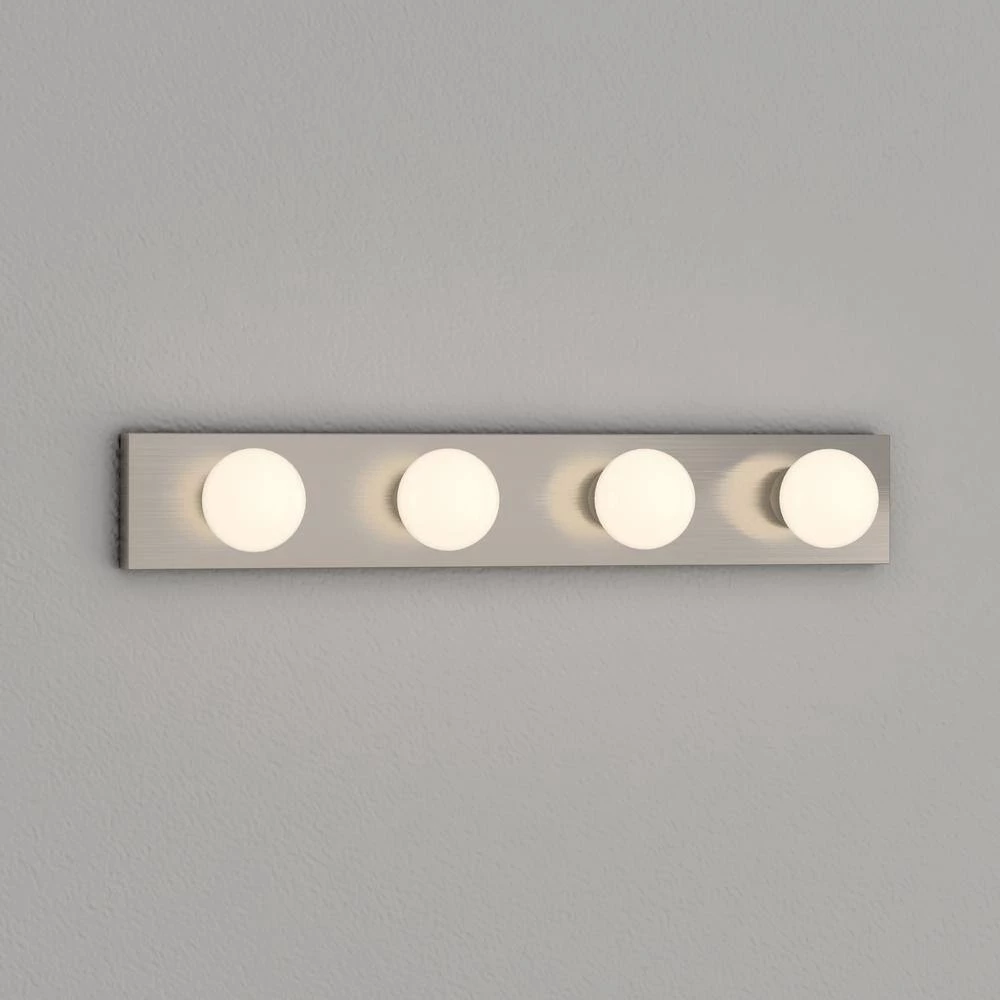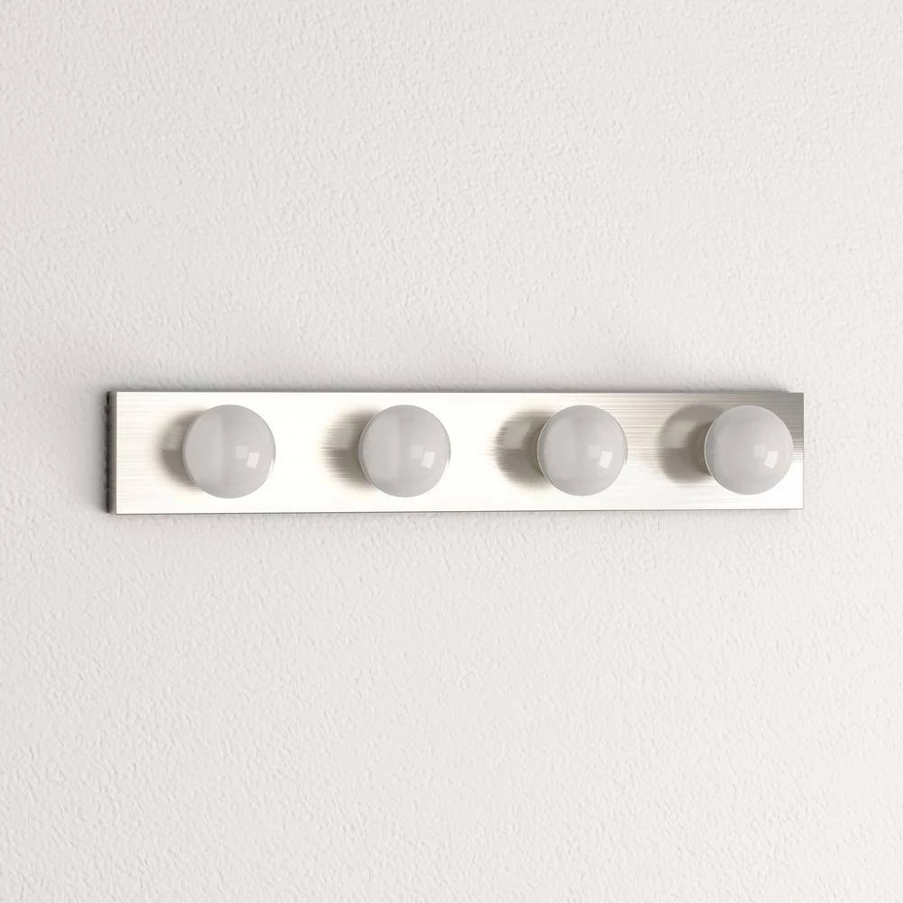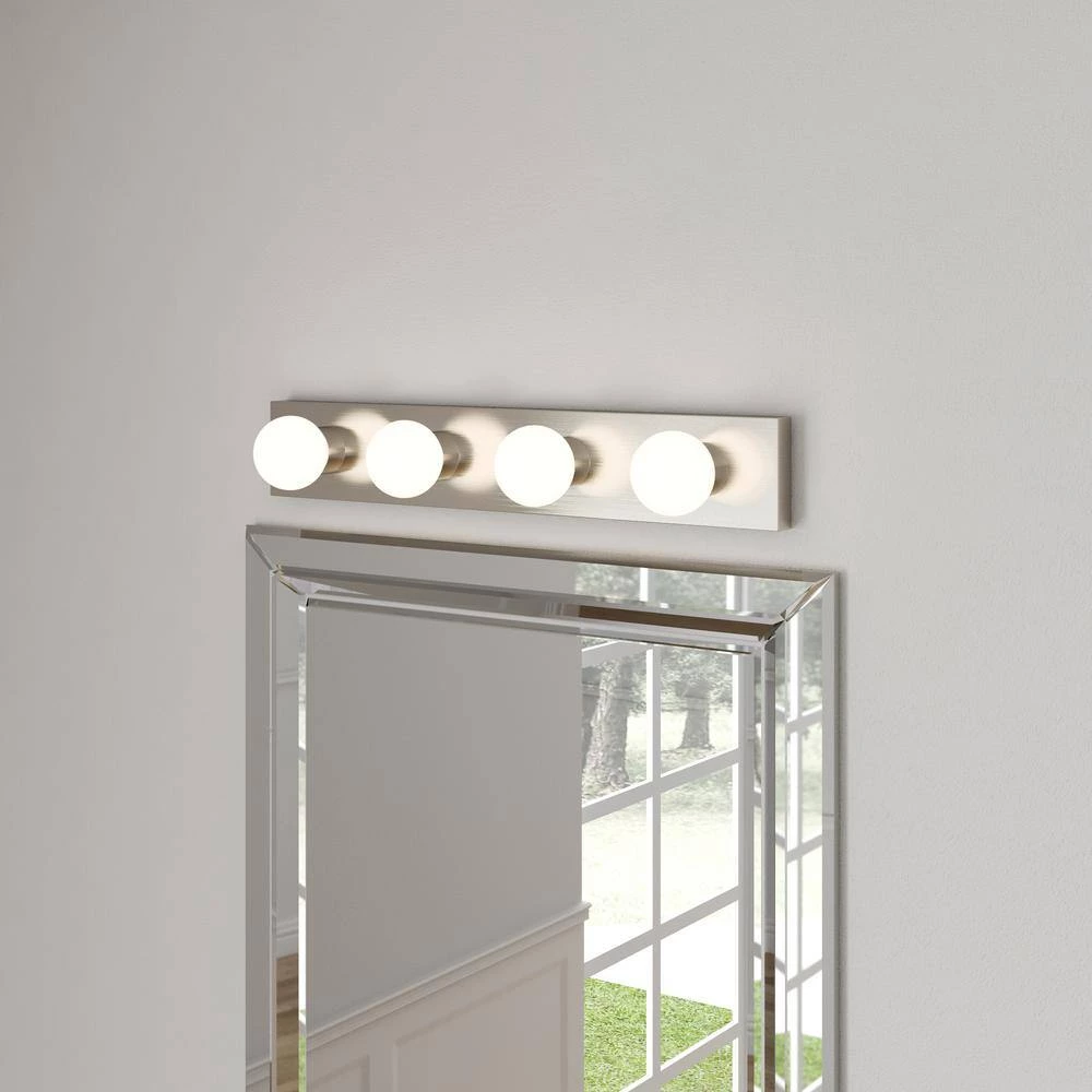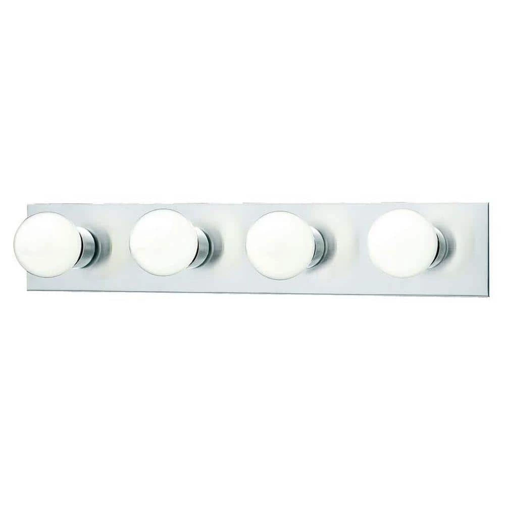 This traditional 4-light bath fixture comes in a brushed nickel finish. The bare light bulb application will provide you with maximum illumination in all directions. With its sharp clean edges this canopy offers a supreme radiance for your bathroom. Also rated for damp locations.