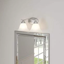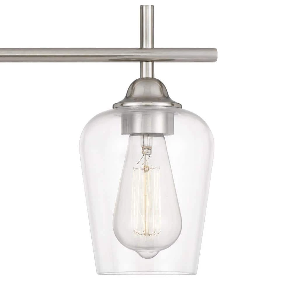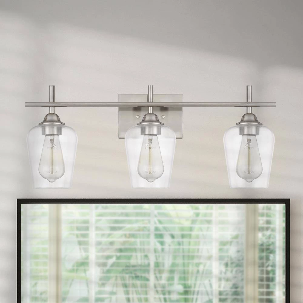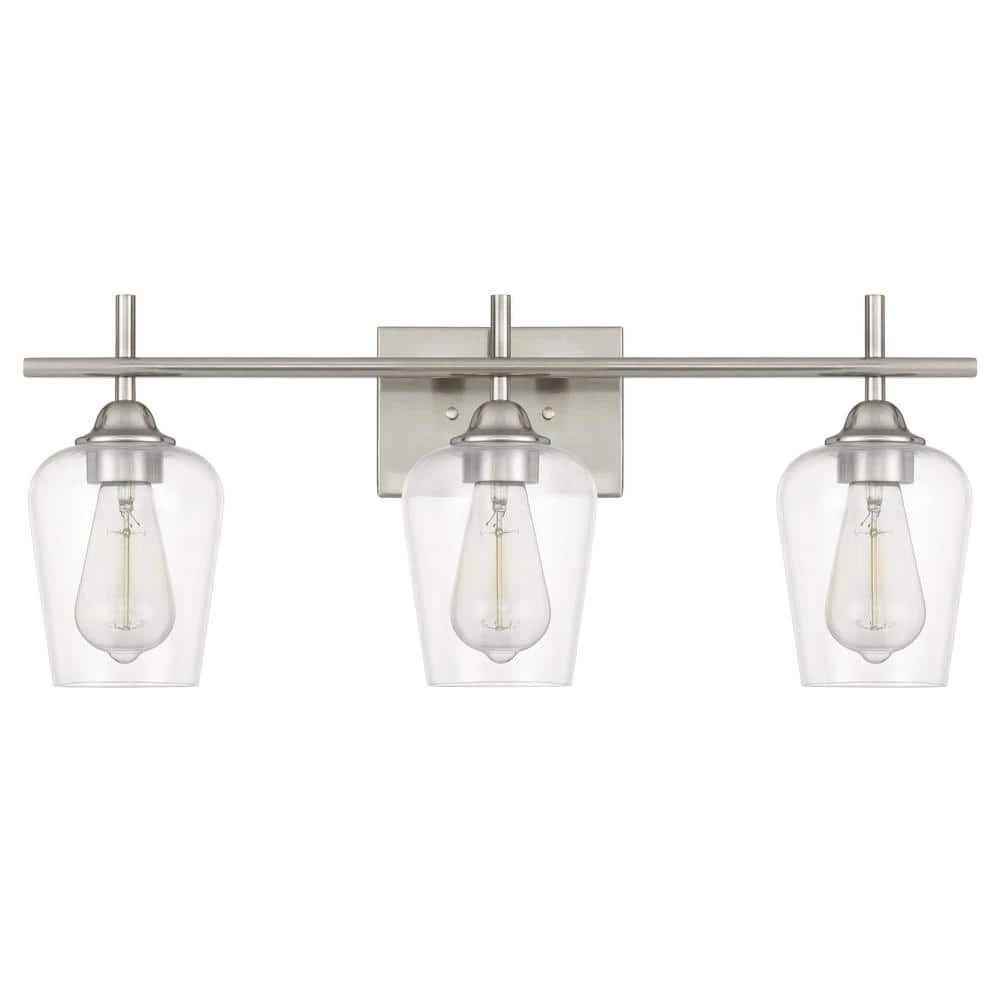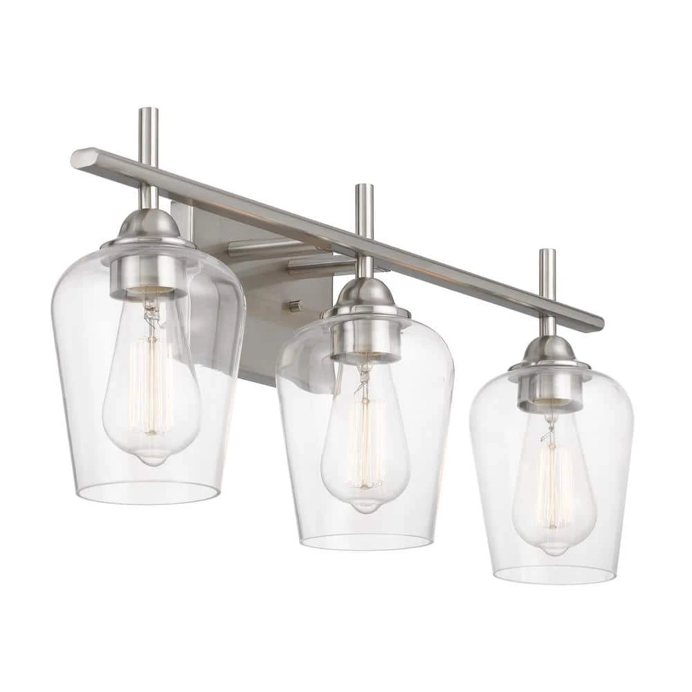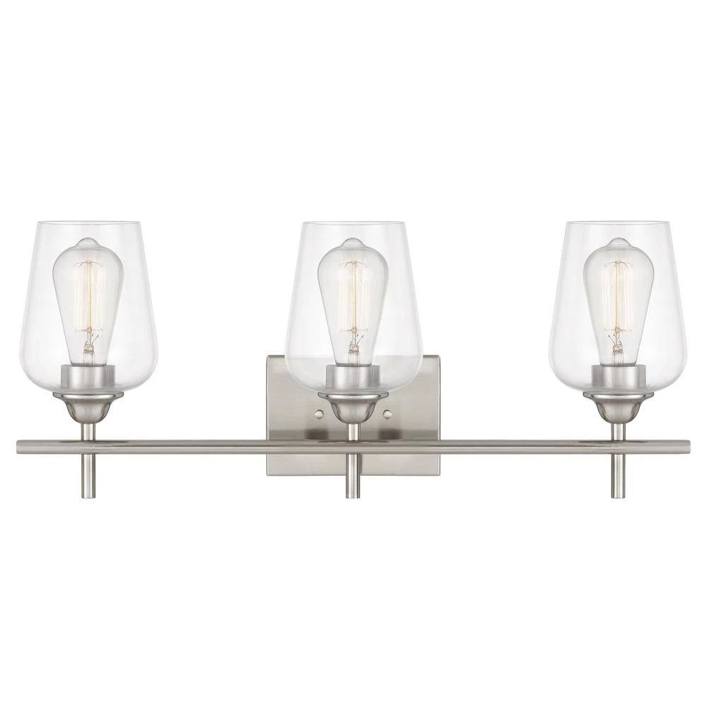 This 3-light vanity light brings a boost of brightness to your morning and evening routine. It showcases a clean-cut rectangle-shaped backplate that has a reversible mounting feature. Attached to the plate is 1 straight horizontal arm that holds 3 clear wine glass-shaped shades. Each shade accommodates 1 medium-base bulb up to 100-Watt that aims to light up, down, or horizontally in the main bathroom or guest room. Plus, it’s compatible with a dimmer switch, allowing you to adjust the lighting to your liking.