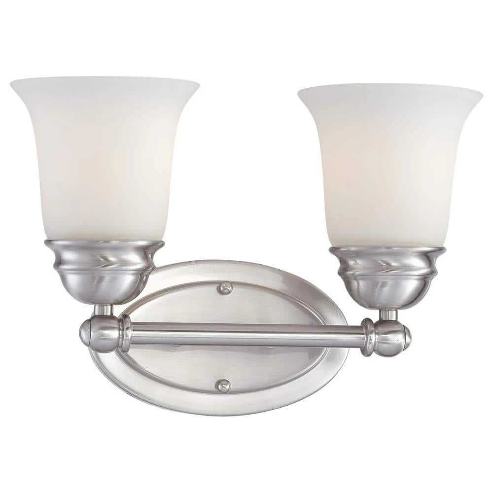 The Bella collection highlights the traditional element of subtle elegance found within a its rounded edge design. This 2-light bath vanity features a brushed nickel finish with etched stylized glass shades. Illuminate your space with this warm and inviting fixture. It may be flush mounted with the glass shade facing up or down and is rated for damp locations.