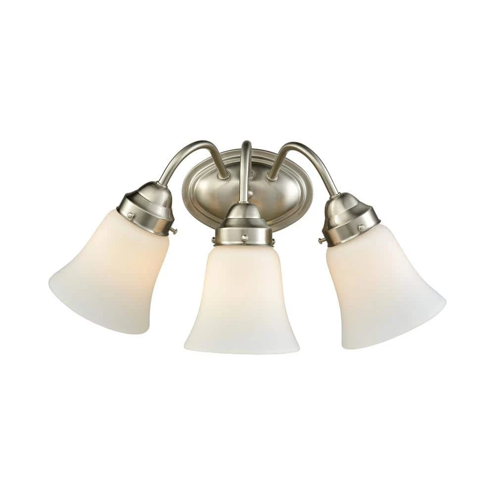 Califon 3 Light Vanity In Brushed Nickel With White Glass. All bath lights are rated for indoor locations. Fixtures are shipped with installation instructions and hardware. Thomas Lighting offers a versatile and stylish range of lighting designed with the builder and specifier in mind, allowing mix and match capabilities across collections.