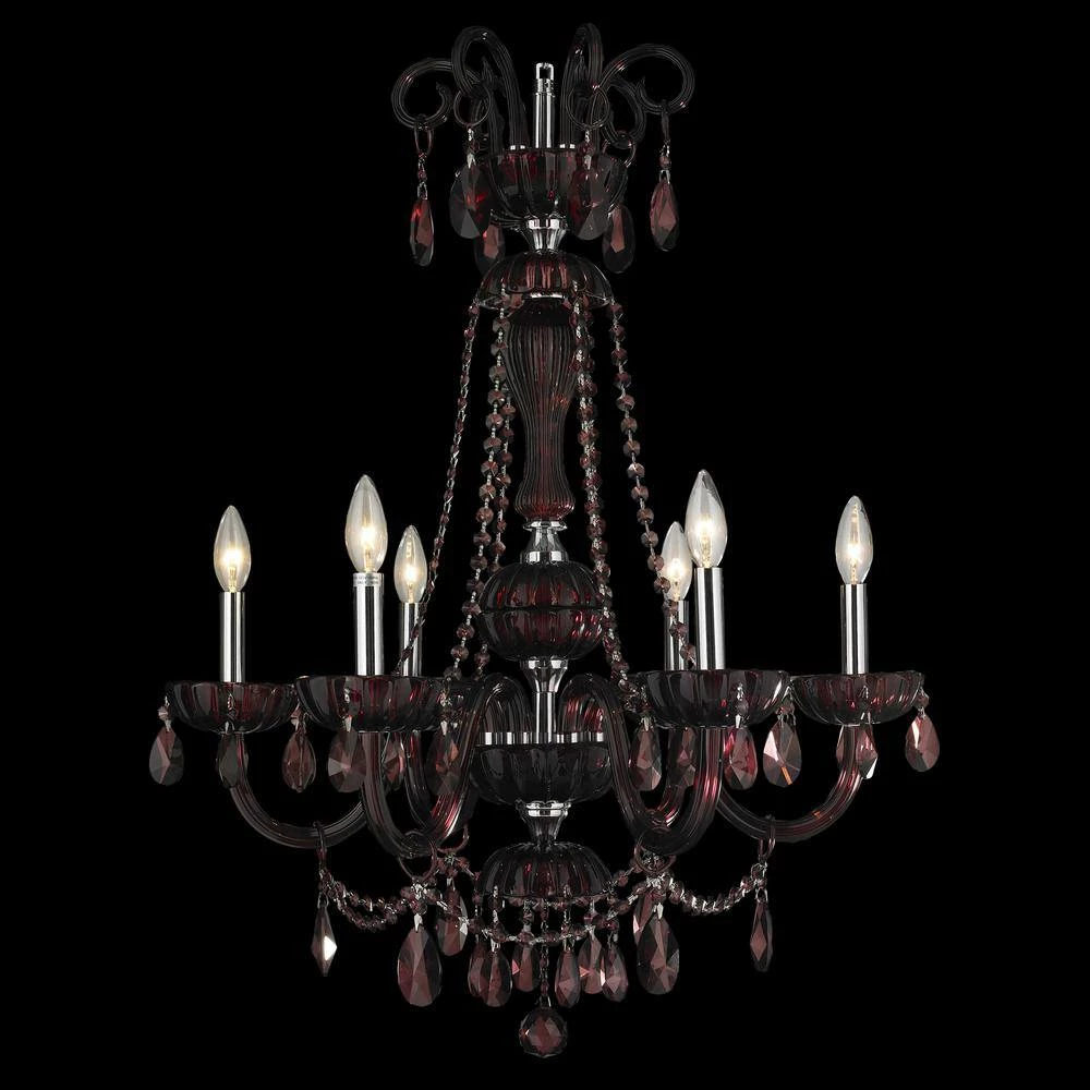 This stunning 6-light Crystal Chandelier only uses the best quality material and workmanship ensuring a beautiful heirloom quality piece. Featuring a radiant chrome finish and finely cut premium grade cranberry red colored crystal with a lead content of 30%, this elegant chandelier will give any room sparkle and glamour. Worldwide Lighting Corporation is a privately owned manufacturer of high quality crystal chandeliers, pendants, surface mounts, sconces and custom decorative lighting products for the residential, hospitality and commercial building markets. Our high quality crystals meet all standards of perfection, possessing lead oxide of 30% that is above industry standards and can be seen in prestigious homes, hotels, restaurants, casinos, and churches across the country. Our mission is to enhance your lighting needs with exceptional quality fixtures at a reasonable price.