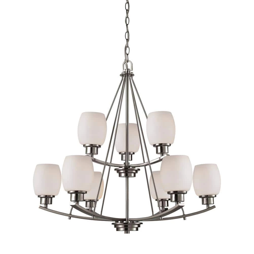 Casual Mission 9 Light Chandelier in Brushed Nickel with White Lined Glass. All chandeliers are rated for indoor dry locations. Fixtures are shipped with installation instructions and hardware. Thomas Lighting offers a versatile and stylish range of lighting designed with the builder and specifier in mind, allowing mix and match capabilities across collections.