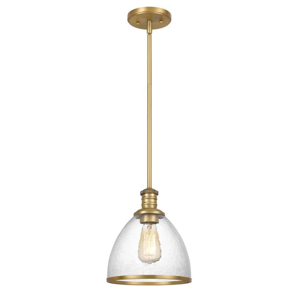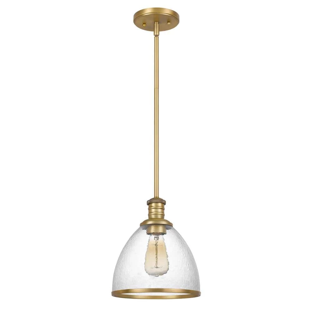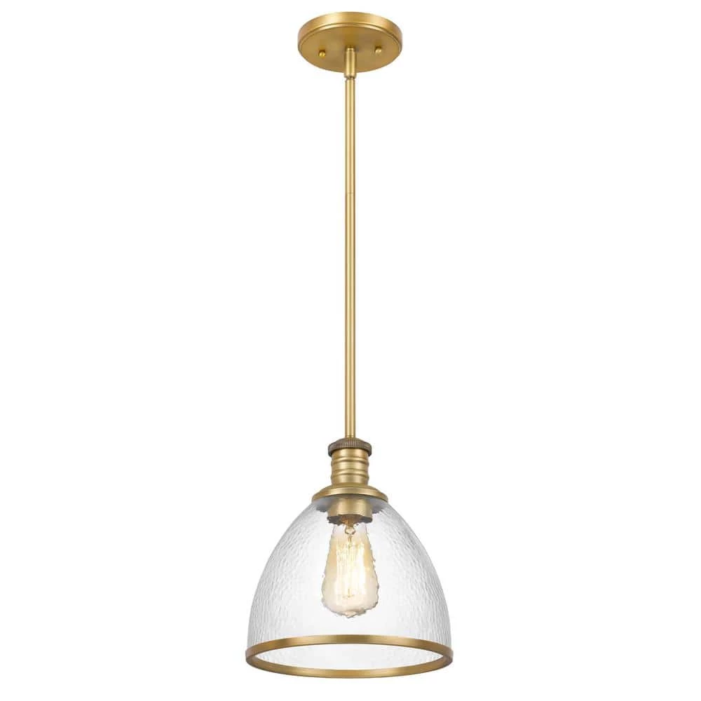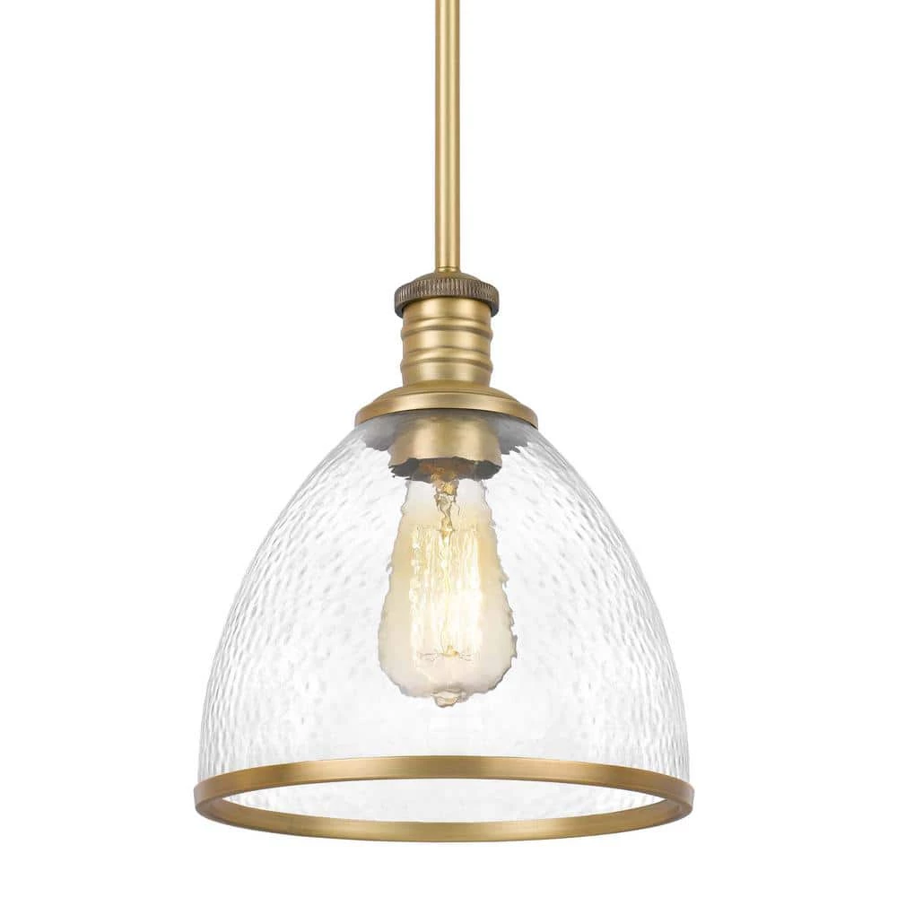 - Constructed of heavy-duty steel in vintage brass finish and clear speckled glass shade