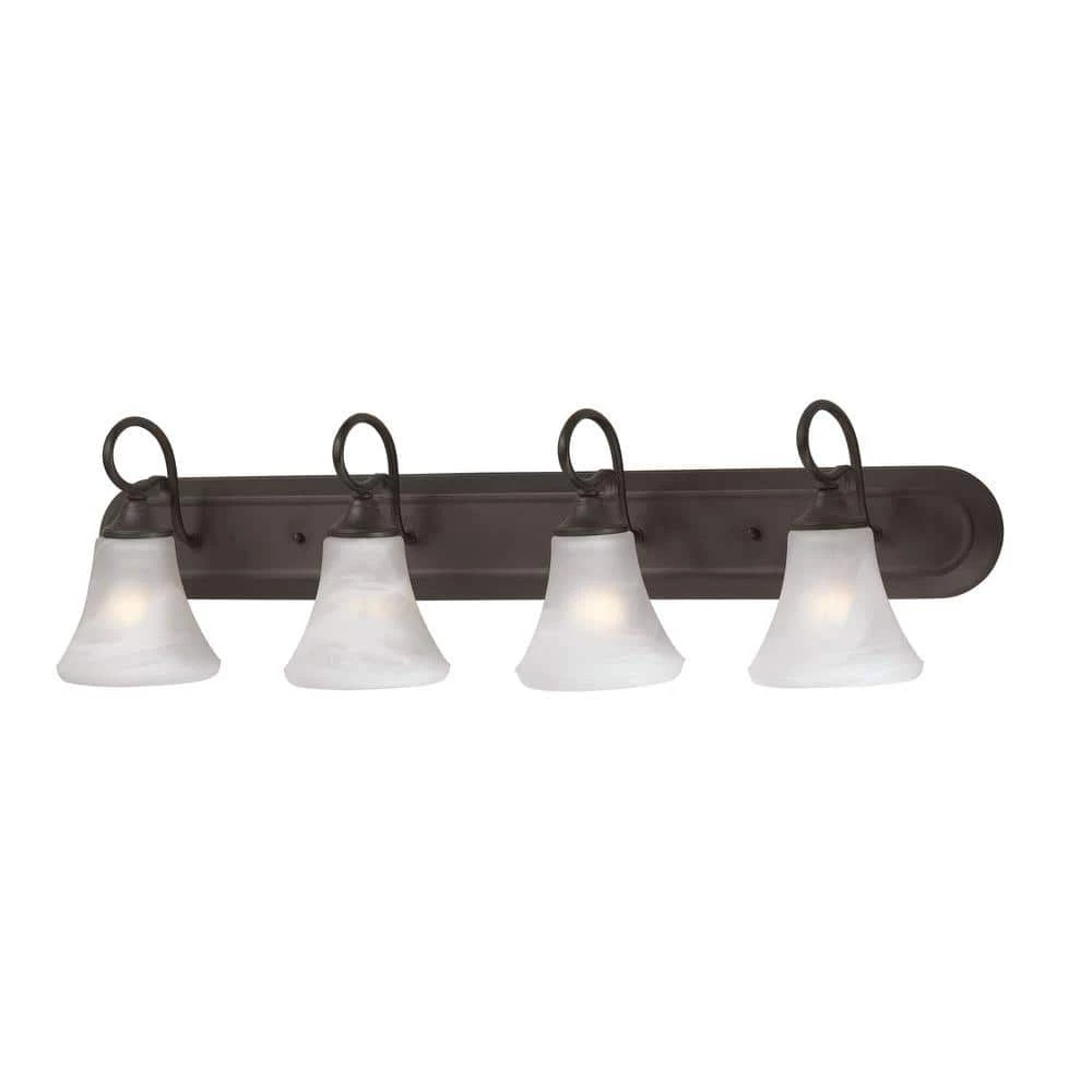 Graceful elliptical arms denote movement and bring elegance to this simple collection. A rich Painted Bronze finish paired with a bell shaped swirl alabaster glass gives this transitional 4-light 100-Watt medium base fixture an undeniable sophistication. Measuring 36 in. W x 9-1/2 in. H extending 8 in. from the wall this fixture may be installed with the glass up or down and is UL listed for damp location, for installation in a bathroom. Coordinating pieces in the Elipse collection (sold separately) allow for endless design possibilities throughout your home.