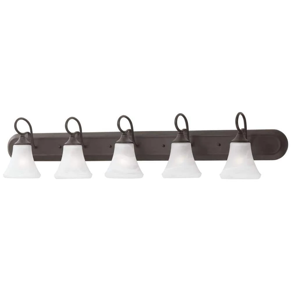 Graceful elliptical arms denote movement and bring elegance to this simple collection. A rich painted bronze finish paired with a bell shaped swirl alabaster glass gives this transitional 5-light 100-Watt medium base fixture an undeniable sophistication. Measuring 48 in. W x 9-1/2 in. H extending 8 in. from the wall this fixture may be installed with the glass up or down and is UL listed for damp location, for installation in a bathroom. Coordinating pieces in the Elipse collection (sold separately) allow for endless design possibilities throughout your home.
