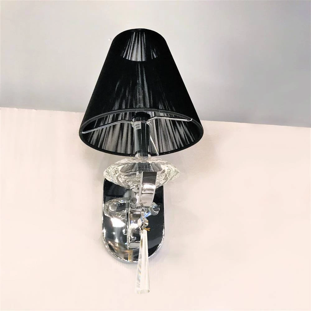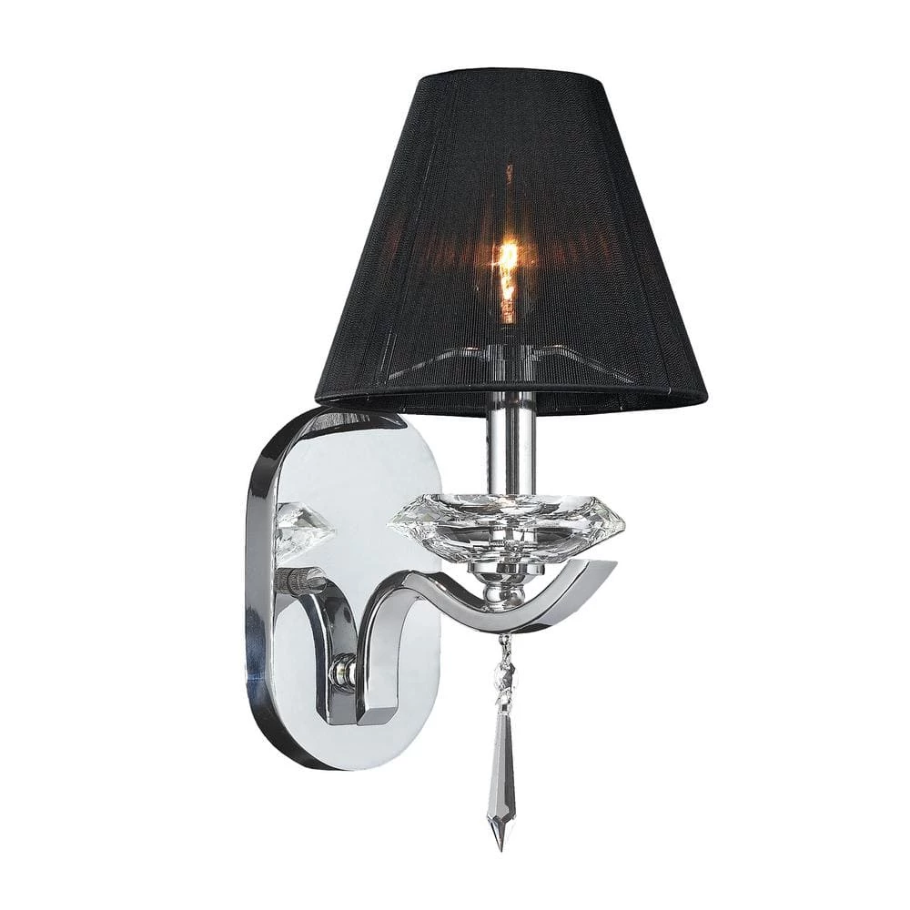 This stunning 1-light crystal wall sconce uses only the best materials and quality workmanship ensuring a beautiful heirloom quality piece. Featuring a radiant chrome finish, beautifully curved arm with black string shade and clear crystal embellishments made of finely cut premium grade 30% full lead crystal, this elegant wall sconce will give any room sparkle and glamour. HSL Worldwide Lighting Corporation headquartered in Hayward, CA, is a privately owned manufacturer of high-quality crystal chandeliers, pendants, flush mounts, sconces, and custom decorative lighting products for the residential, hospitality and commercial building markets. Their master craftsmen and designers pride themselves on their attention to detail. Their exclusive high quality crystals meet all standards of perfection. Every crystal piece possesses lead oxide of 30%, cut sharply by a specialized cutting machine then polished precisely by using the latest technology combined with old-world knowledge to produce superior sparkle and prismatic brilliance. With over sixty years of combined experience in the lighting industry, they have produced exceptional quality illumination worldwide seen in prestigious homes, hotels, restaurants, casinos, and churches across the country. Worldwide Lighting welcomes the opportunity to illuminate yours.