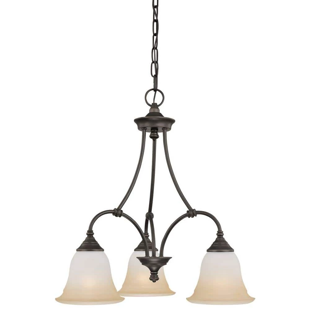 The Harmony collection offers simplicity and purity of form as the key elements of this stylish collection. Its clean appearance, its airy openness and its lack of excessive ornamentation, make it a true classic. The sweeping arms and rich Aged Bronze finish bring a casual elegance to any interior space. Measuring 20 in. W x 21 in. H this 3-light chandelier is a gorgeous focal point over a dining table or makes a statement and place multiples over a kitchen island. The warm glow of the three 100-Watt medium base light bulbs through the hand-painted white marble glass provides a relaxing ambience. To complete your interior the Harmony collection contains additional coordinating pieces allowing for endless design possibilities throughout your home.