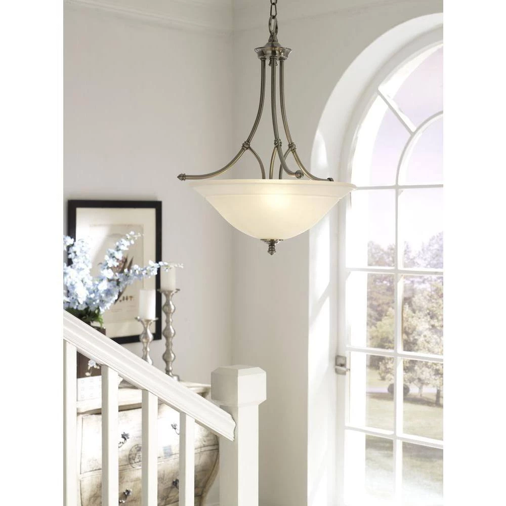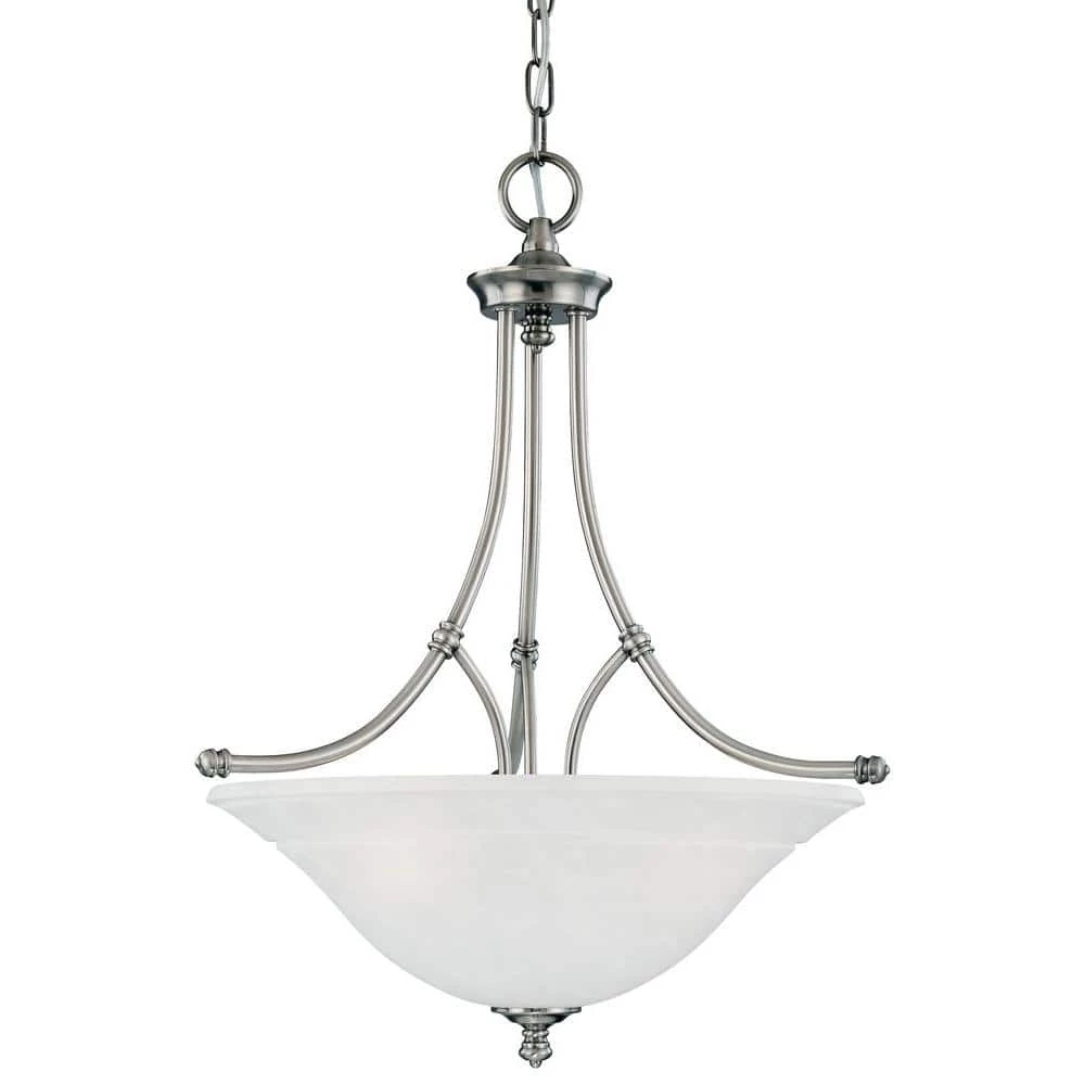 The Harmony collection offers simplicity and purity of form as the key elements of this stylish collection. Its clean appearance, its airy openness and its lack of excessive ornamentation, make it a true classic. The sweeping arms and rich Satin Pewter finish brings a casual elegance to any interior space. This 3-light pendant measures 21 in. W x 25 in. H. Included in the package is an additional 12 ft. of wire and 6 ft. of chain giving this fixture an overall height of 97 in., allowing to customize the height for your space. The warm glow of the three 100-Watt medium base light bulbs through the hand-painted white marble glass makes this pendant a perfect addition to any kitchen, dining area or small foyer. To complete your interior the Harmony collection contains additional coordinating pieces allowing for endless design possibilities throughout your home.
