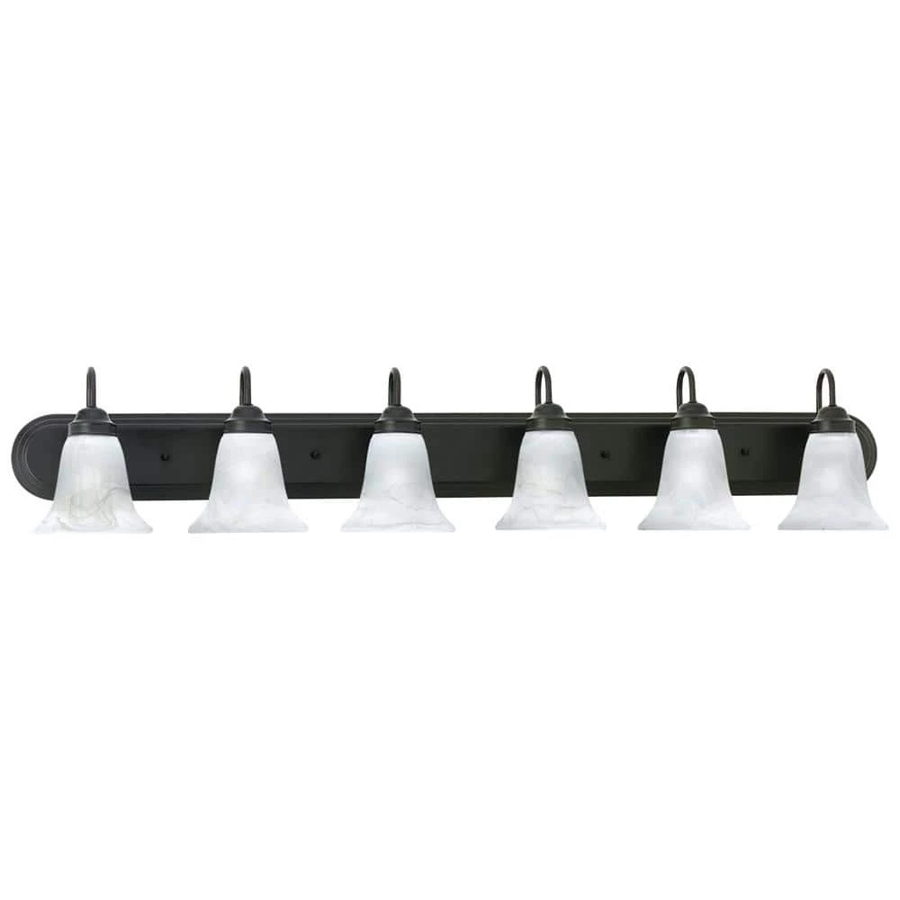 This transitionally styled 6-light bath fixture comes in a painted bronze finish with swirl alabaster style glass. Complement your bathroom with this stunning vanity. The alabaster swirl glass and painted bronze finish enriches any space with elegance, creating a luxurious feeling.