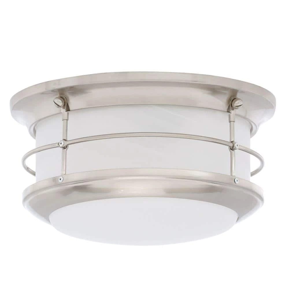 Refresh the lighting in your home with this Newport Two-Light Brushed Nickel Outdoor Flush Mount. It’s the perfect touch to a contemporary home with an etched alabaster white glass shade and a brushed nickel finish. It’s suitable for outdoor use on a patio, or indoors in a hallway or bedroom. This flushed lantern uses two 60-W bulbs (sold separately).
