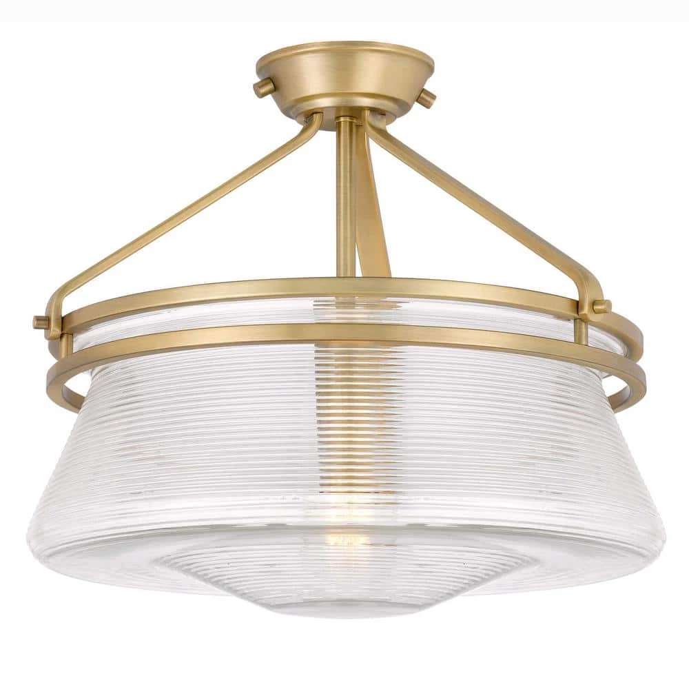 - Constructed of heavy-duty steel in aged brass finish and embossed glass shade