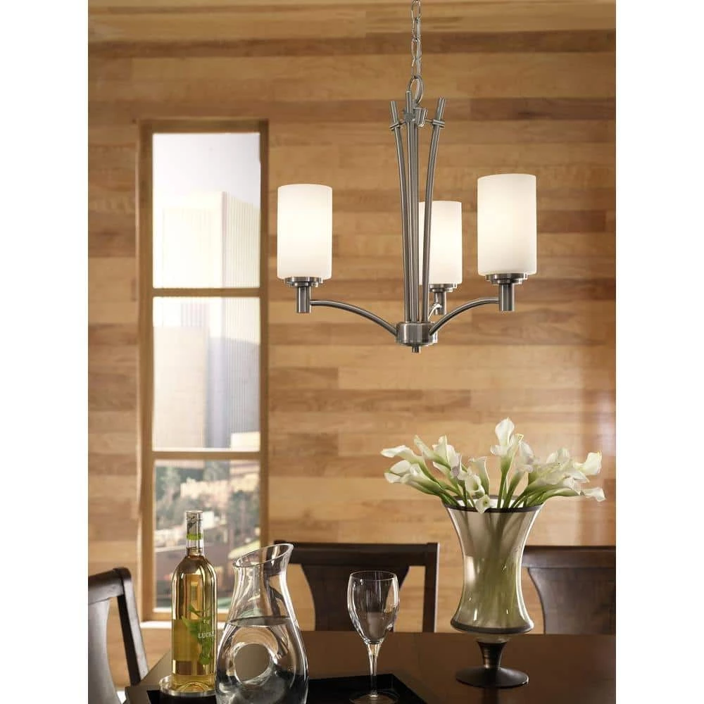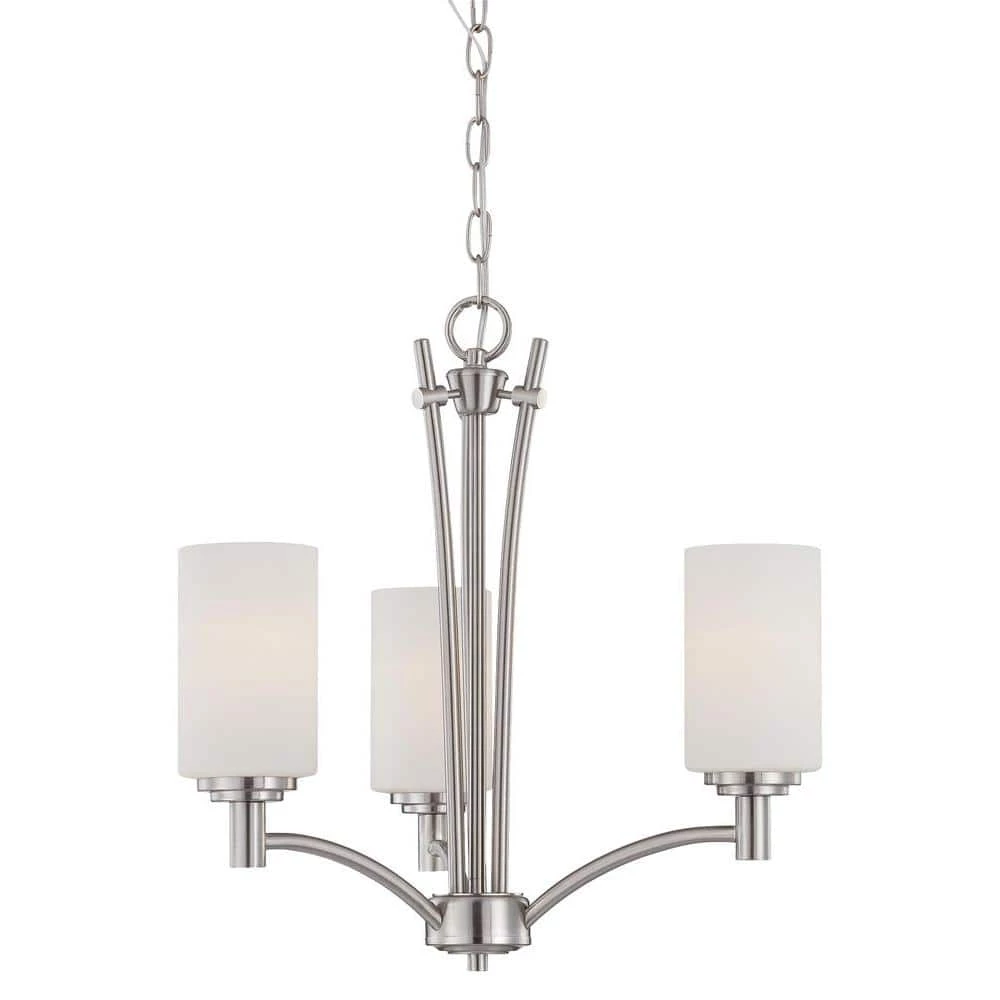 Pittman boasts a strong transitional presence with a subtle Asian aesthetic. Great mechanical forms and simple profiling make this collection current and dignified. A clean, fresh look with an evident charm providing instant character to any space. A gorgeous focal point over a dining table or make a statement and place multiples over a kitchen island. This 20 in. W x 19 1/2 in. H three light Brushed Nickel finish chandelier, provides a warm light through its contemporary etched glass shades. Furthermore, the fixture comes with 12 ft. of wire and 4 ft. of chain to customize the height for your space. Additional coordinating pieces in the collection allow for endless design possibilities throughout your home.