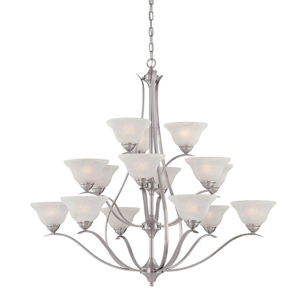 The Prestige lighting collection of hanging chandeliers offers oval tubing and alabaster stylized glass shade that produces a sweeping design with graceful curves. Shed a warm glow and welcoming light with this chandelier that features 15-light 40-Watt equivalent medium base Philips bulbs (not included). The rich brushed nickel finish compliments the design of today’s traditional interiors. Measuring 48 in. W x 45 in. H, it comes with 12 ft. of wire and 6 ft. of chain to customize the height for your space. A gorgeous focal point in high ceiling rooms or in foyers. Additional coordinating pieces (sold separately) in the collection allow for endless design possibilities throughout your home.