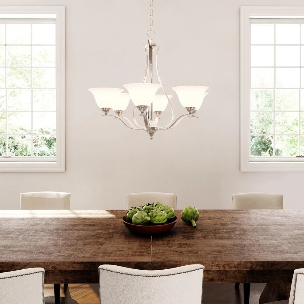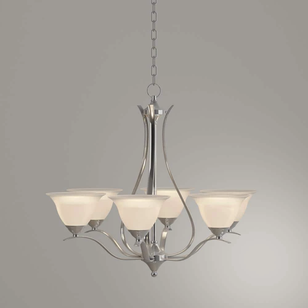 Oval tubing and alabaster glass produces a sweeping design with graceful curves. Shed a warm glow and welcoming light on the happenings beneath with the Prestige 6-light 100-Watt medium base chandelier. The rich brushed nickel finish compliments the design of today’s traditional interiors. Measuring 29 1/2 in. W x 26 in. H comes with 12 ft. of wire and 6 ft. of chain to customize the height for your space. A gorgeous focal point over a dining table or in multiples over a kitchen island. Additional coordinating pieces (sold separately) in the collection allow for endless design possibilities throughout your home.