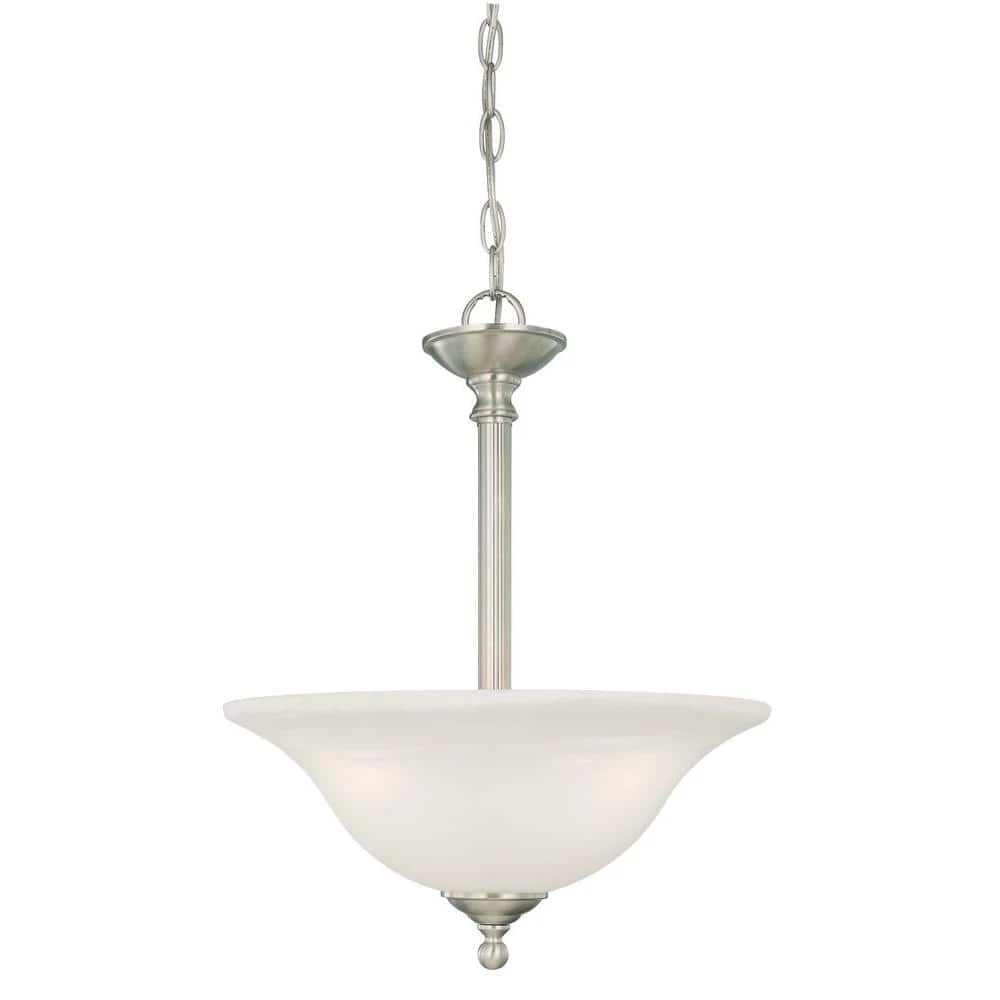 Capturing the essence of classical architecture, with its clean Brushed Nickel finish complements the design of today’s traditional interiors. The receded center column fused with the graceful curved arms creates a casual elegance. This 16 in. W x 19 in. H pendant is illuminated by three 100-Watt medium base bulbs providing a warm white glow through the etched swirl alabaster style glass shade, perfect for placement over a dining table, in a kitchen, stairwell or small foyer. Furthermore, the fixture comes with 12 ft. of wire and 4 ft. of chain to customize the height for your space. Additional coordinating pieces in the collection allow for endless design possibilities throughout your home.