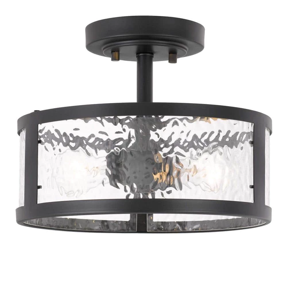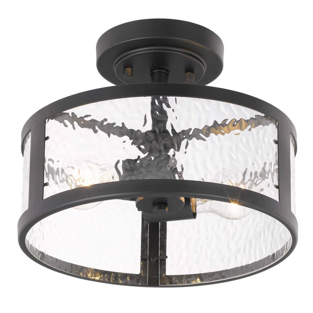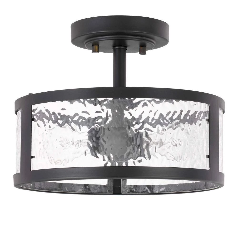 - Constructed of heavy-duty steel in black finish and water grain glass shade