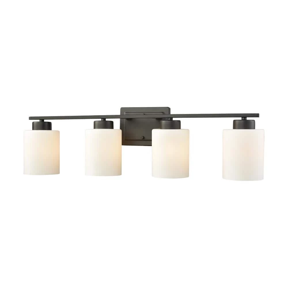 Summit Place 4 Light Vanity In Oil Rubbed Bronze With Opal White Glass. All bath lights are rated for indoor locations. Fixtures are shipped with installation instructions and hardware. Thomas Lighting offers a versatile and stylish range of lighting designed with the builder and specifier in mind, allowing mix and match capabilities across collections.