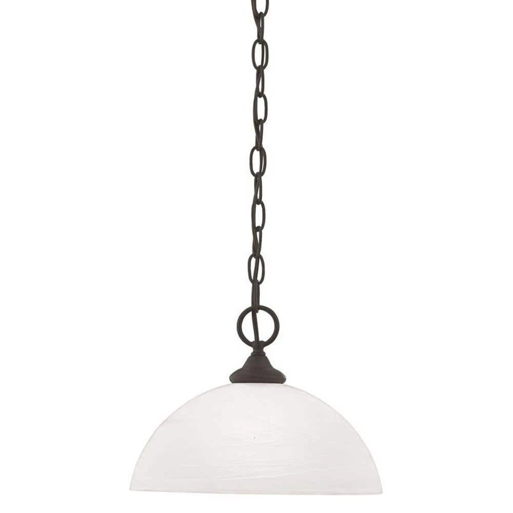 The Tahoe collection with its interlacing arms, warm painted bronze finish and alabaster glass, captures the flexibility of today’s transitional style. An exceptional fixture making it an ideal piece over a dining table or makes a statement and place multiples over a kitchen Island. This 3-light pendant is 12 in. W x 9 in. H provided with 12 ft. of wire and 4 ft. of chain to customize the height for your space. The warm glow that shines upon the happenings beneath is provided by one 150-Watt medium base light bulb (not included). Bring cohesion throughout your home with additional coordinating Tahoe fixtures (sold separately).