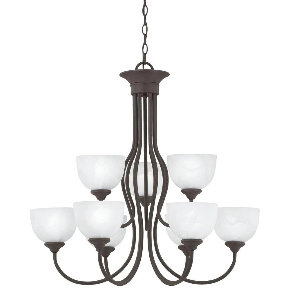 The Tahoe collection with its interlacing arms, warm Painted Bronze finish and alabaster glass, captures the flexibility of today’s transitional style. An exceptional fixture making it an ideal piece over a dining table, in a bedroom, living room or foyer. This two tier 9-light chandelier is 30 in. W x 29 in. H provided with 12 ft. of wire and 6 ft. of chain to customize the height for your space. The warm glow that shines upon the happenings beneath is providing by nine 60-Watt medium base light bulbs (not included). Bring cohesion throughout your home with additional coordinating Tahoe fixtures (sold separately).