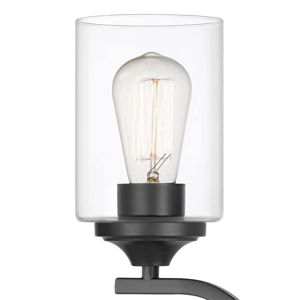 - Constructed of heavy-duty steel in black finish and clear glass shade
