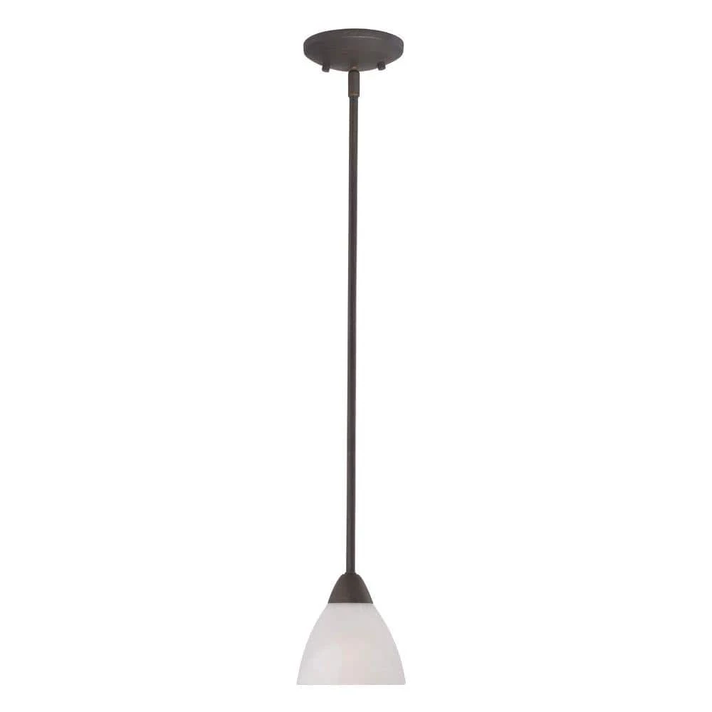 The graceful, simplicity of the Tia collection provides an element of subtlety and elegance. This 1-light mini-pendant comes in a painted bronze finish. And the etched swirl stylized glass complements this lovely traditional collection. Ideal for use in kitchens, dining areas, foyers, and other living areas. To help you personalize the style of your home this fixture is accompanied by two 6 ft. rods, 12 ft. of wire and two 12 in. of chain. The extension rod sold separately.