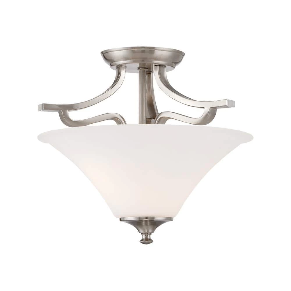 Two-Light Semi-Flushmount Fixture In Brushed Nickel Finish With Etched White Glass. All semi-flushmount lights are rated for indoor locations. Fixtures are shipped with installation instructions and hardware. Thomas Lighting offers a versatile and stylish range of lighting designed with the builder and specifier in mind, allowing mix and match capabilities across collections.