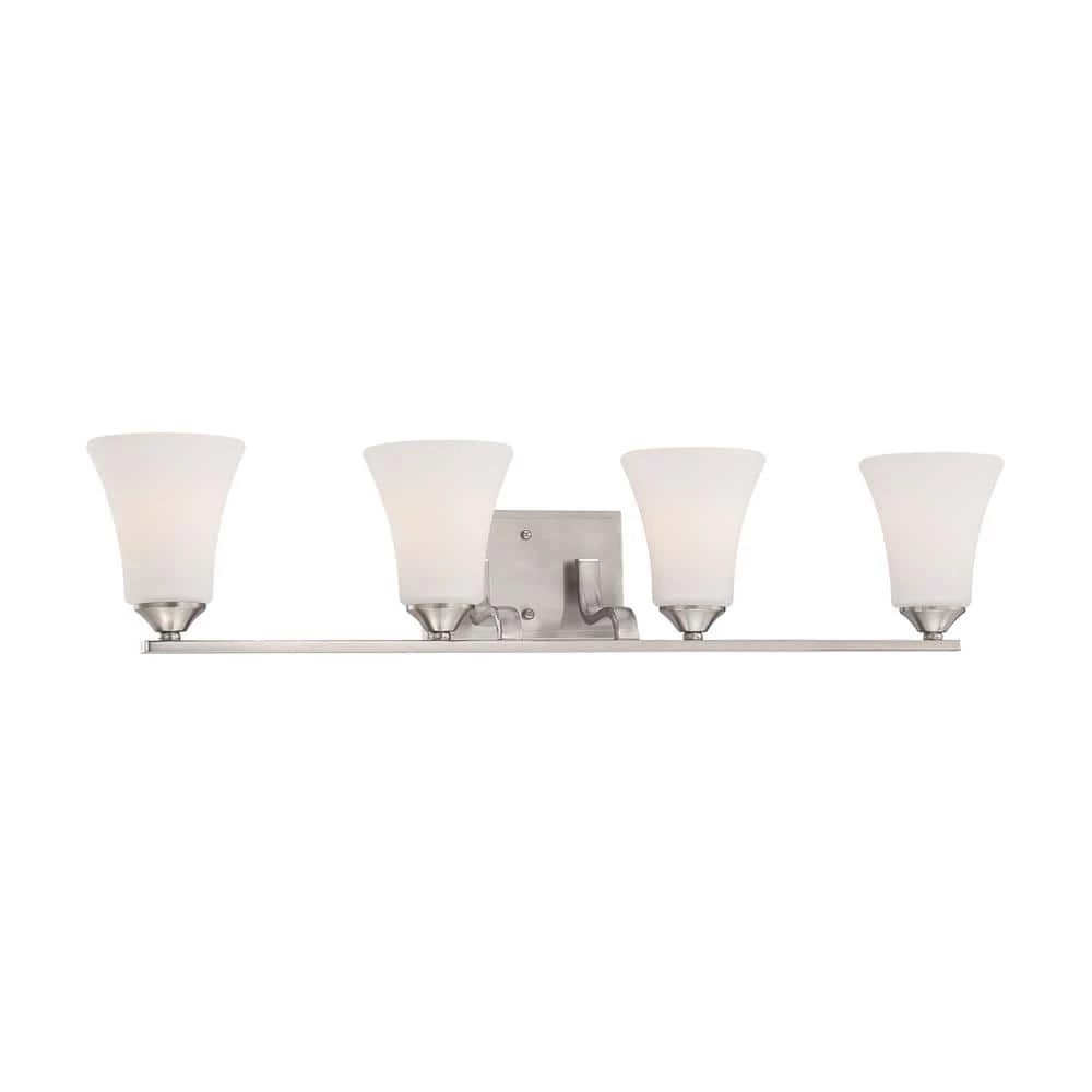 4-Light Bath Fixture In Brushed Nickel Finish With Etched Glass. All bath lights are rated for indoor locations. Fixtures are shipped with installation instructions and hardware. Thomas Lighting offers a versatile and stylish range of lighting designed with the builder and specifier in mind, allowing mix and match capabilities across collections.